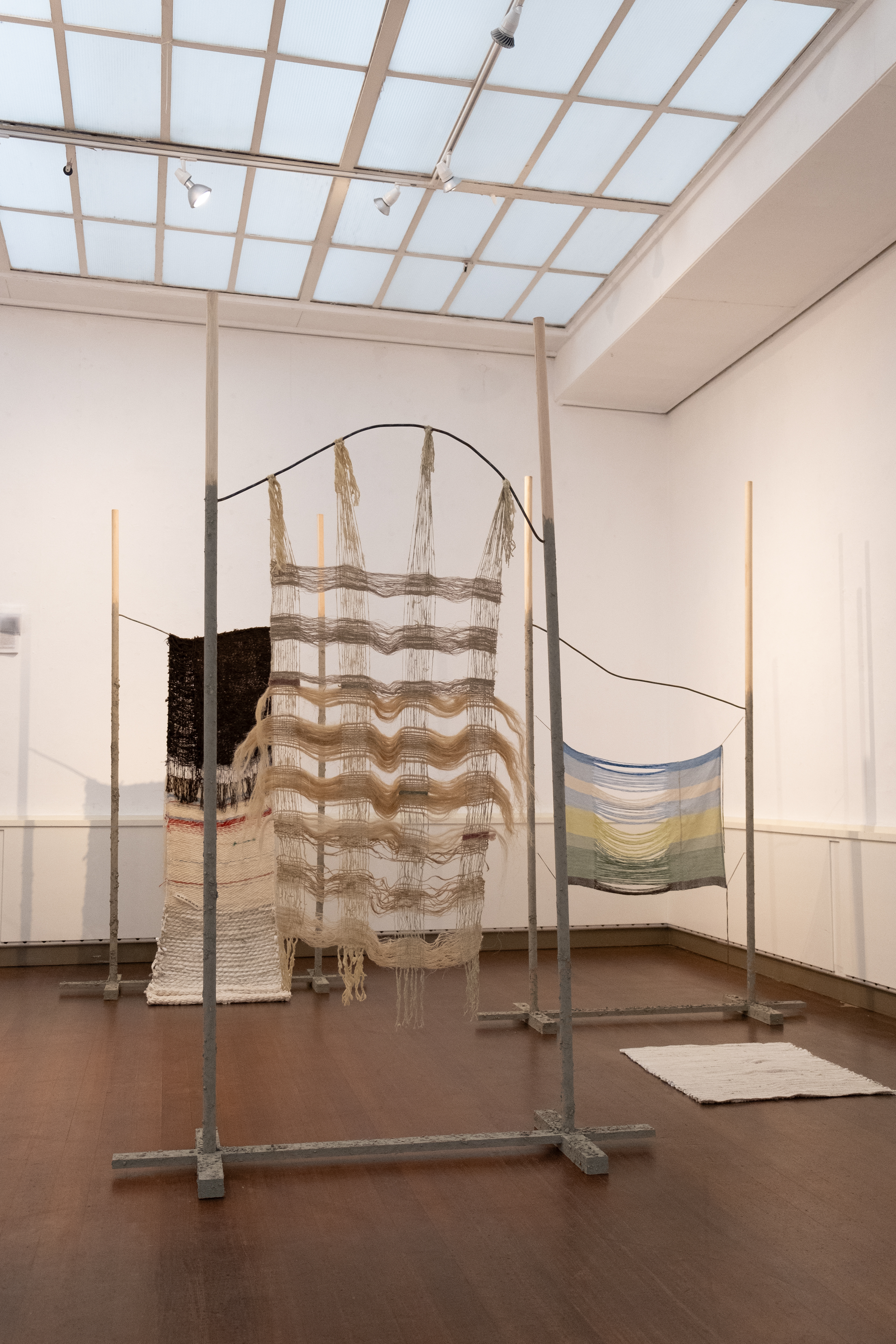 Orden van het Noorden / Northern Orders explores the interweaving of more-than-human natural systems and the human drive to control and possess, two forces that meet on the salt marshes of Groningen: a landscape shaped by tidal rhythms and human-imposed steering mechanisms. With handweaving as a system flowing from the human hand, and binding patterns generated from numerical water data, the materiality of the textiles carries questions of ownership, use, and adaptation of this so called reclaimed land and its resources. The installation visualizes shifts in power structures and investigates how artistic co-creation can offer new perspectives on our surrounding landscapes. Thus the work continuously reflects on the tension between natural systemicity and human ordering – and on the ways we attempt to shape the world to our hand and desire.